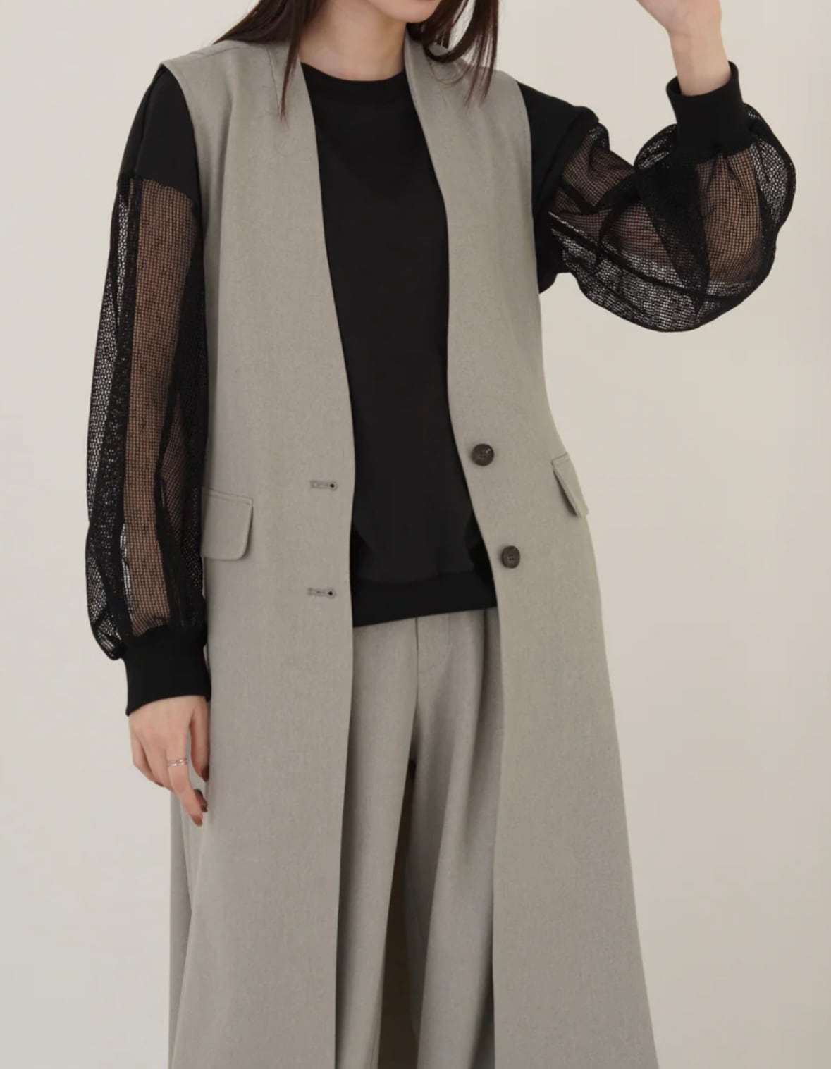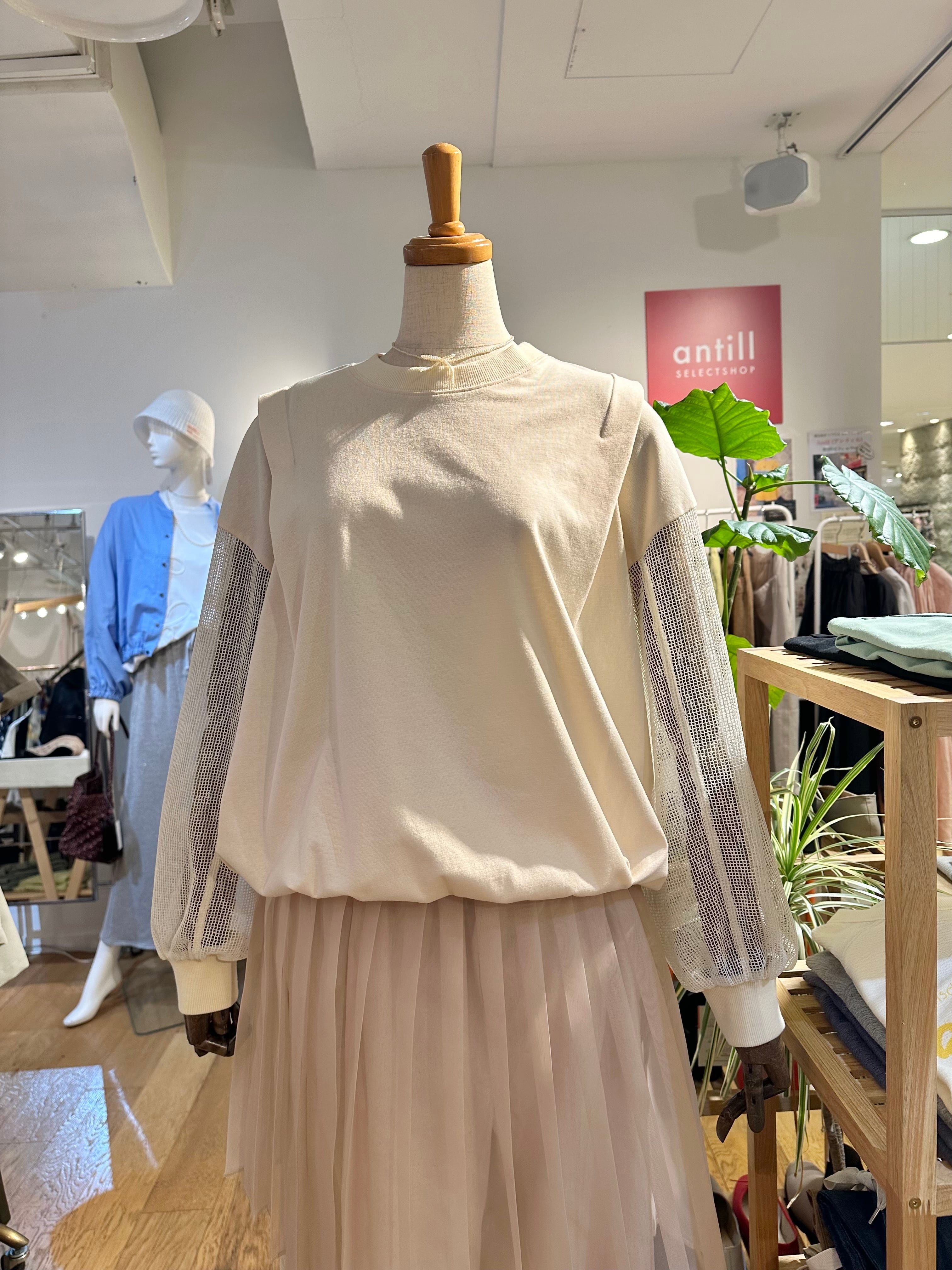 袖部分をトレンドのメッシュで切り替えたプルオーバー。身頃には毛羽の少ない、きれいな表面感の薄手ポンチを使用。メッシュにはブライト糸が使用してあり、微光沢があります。暑さの残る初秋から取り入れやすいアイテムです。