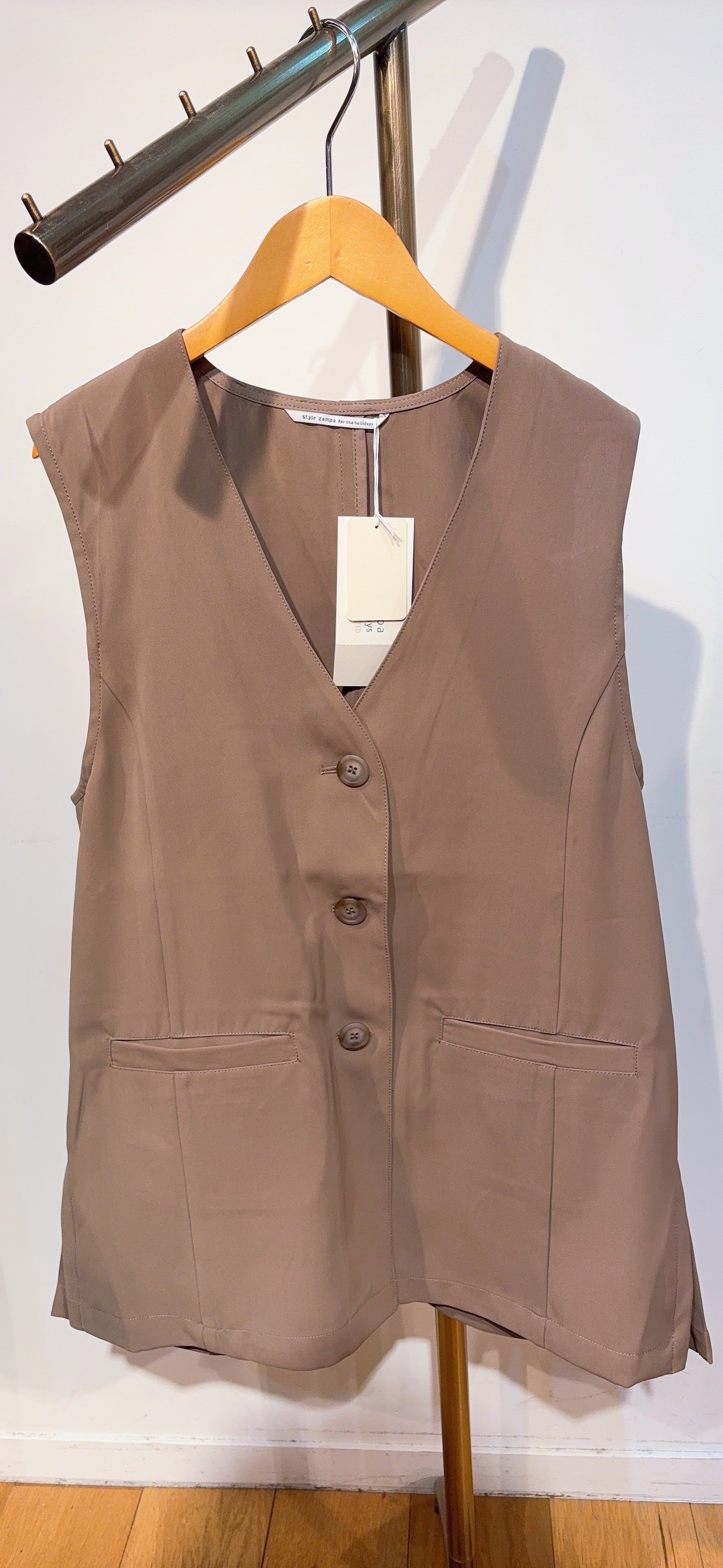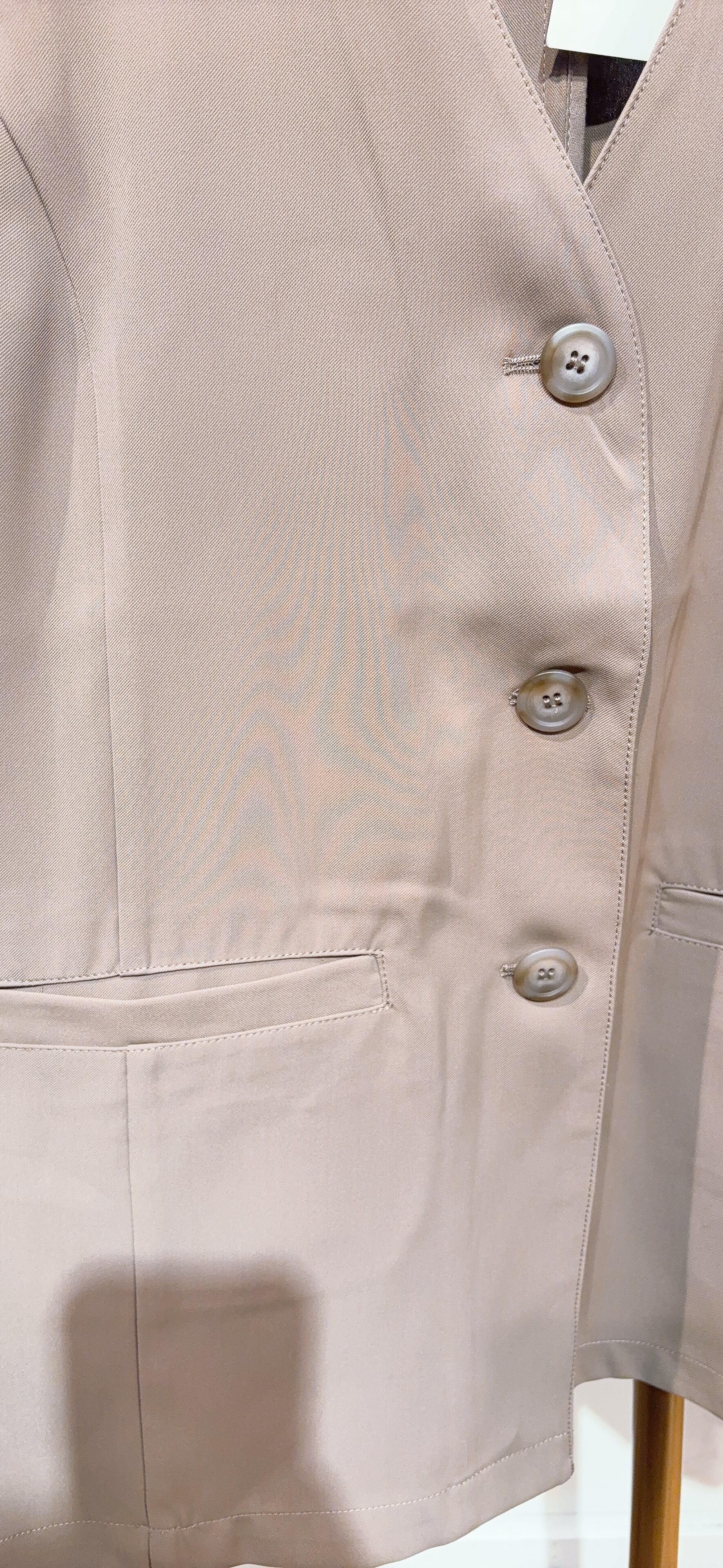 シンプルジレはポリエステル素材でサラッとした着心地。デザインは両サイドスリットがあり、ポケットも付いてます。メンズライクなデザインなのでお仕事でも使えそうです。