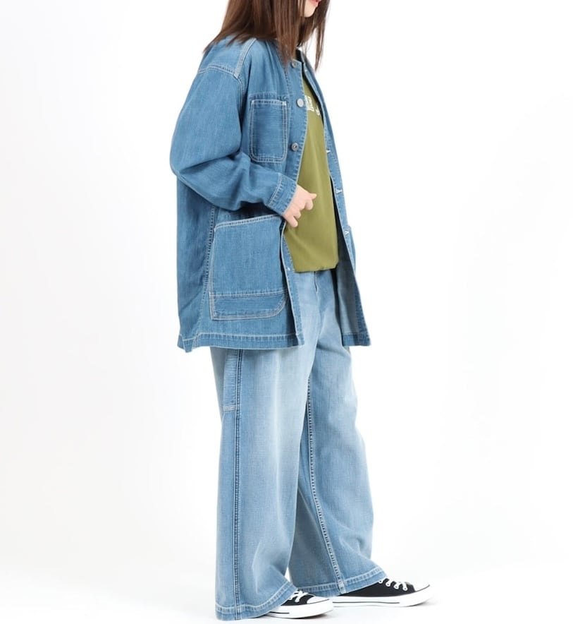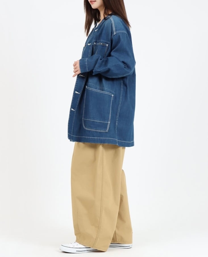 ゆったりとしたオーバーサイズで、厚手トップスの上からもごわつかず羽織れるのも嬉しいポイント。無骨すぎない軽やかな印象のステッチワークや