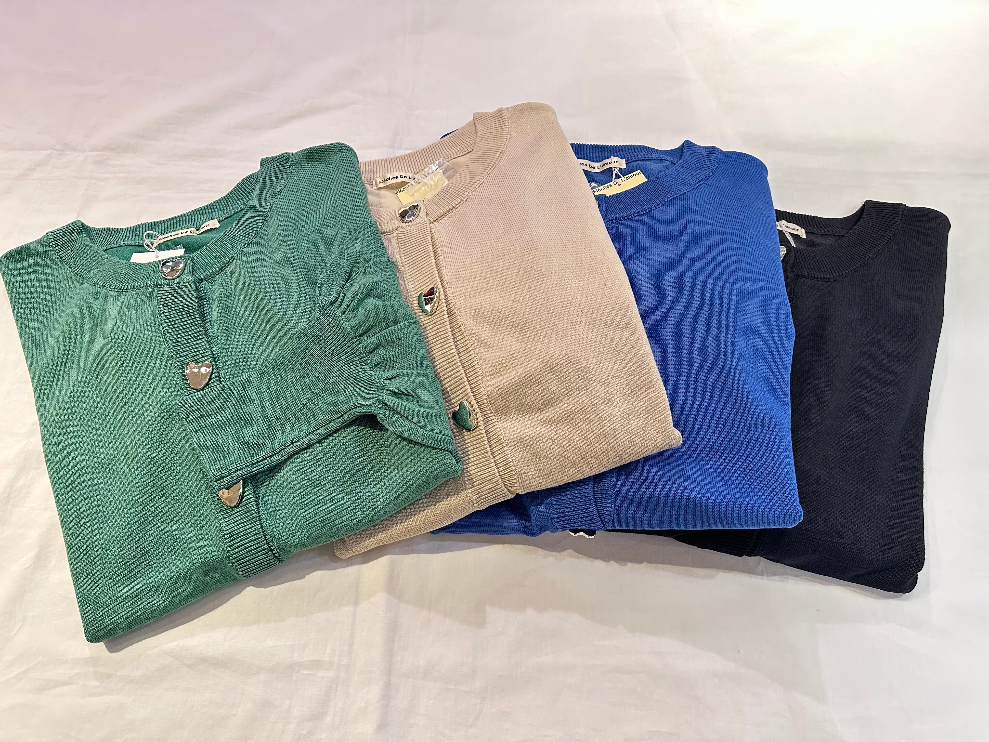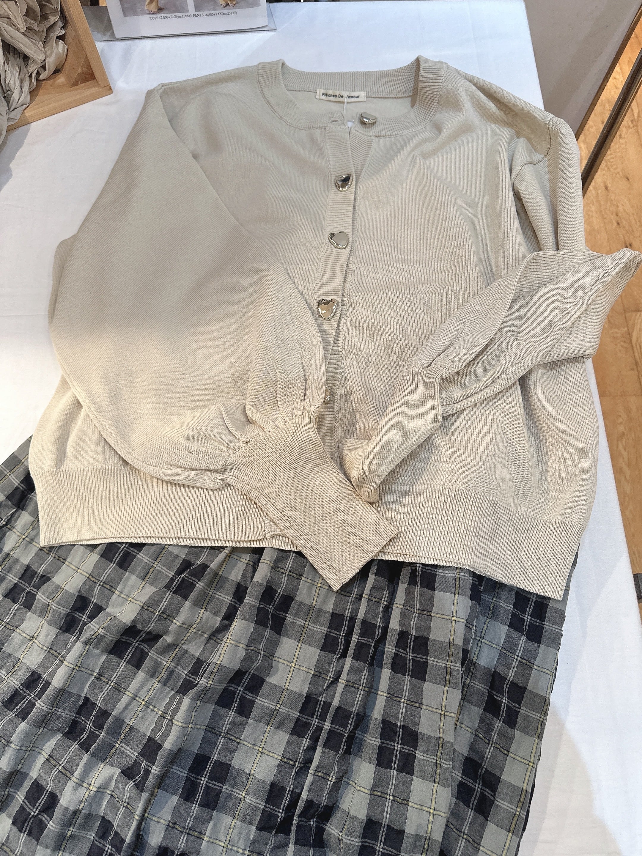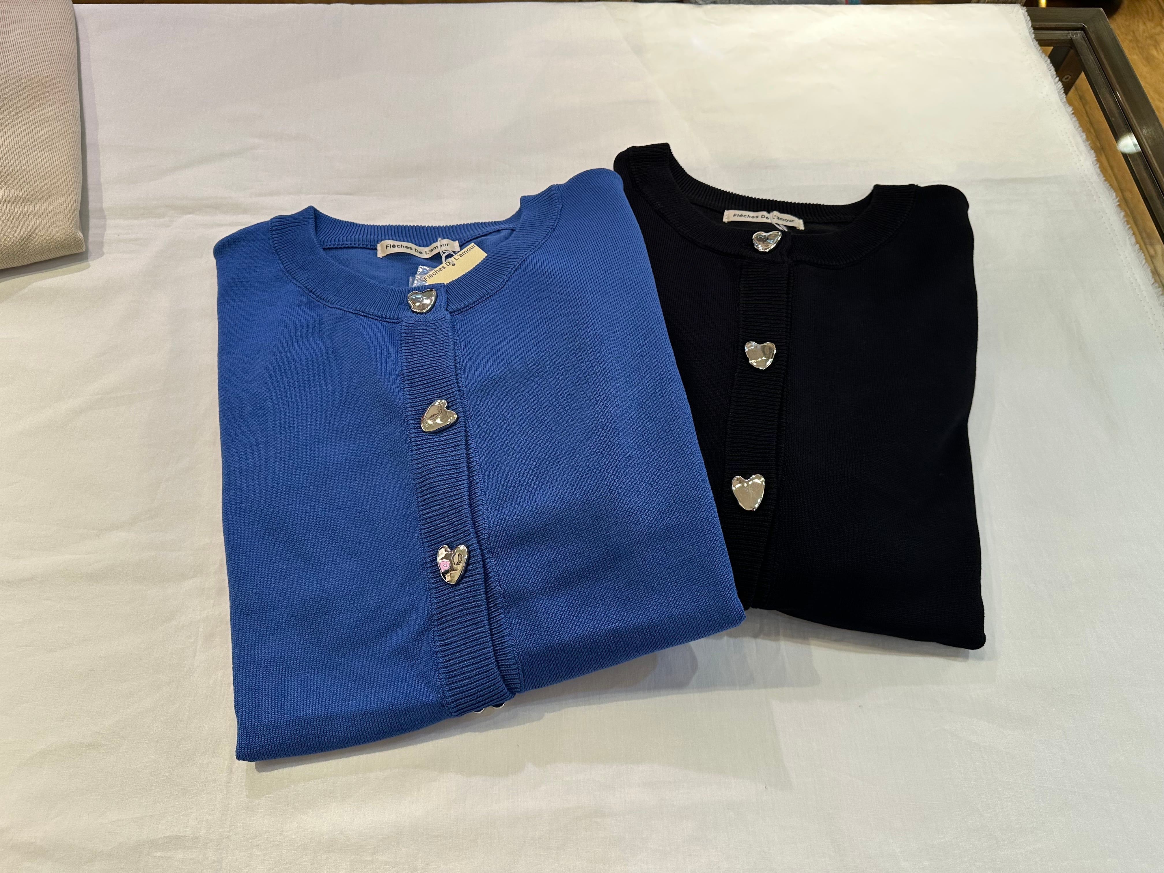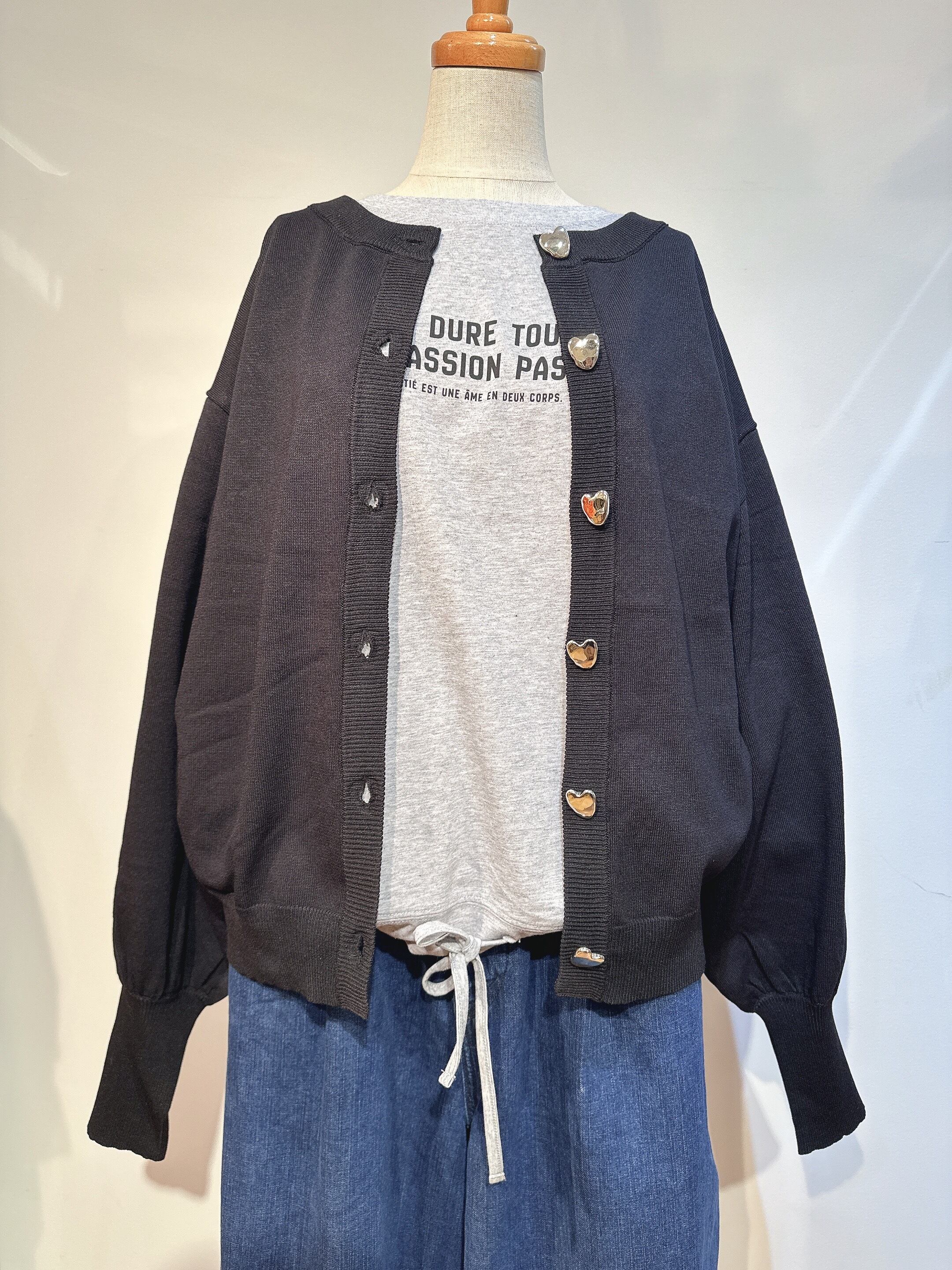 ハート型のようなストーンのようなシルバーのボタンがポイントのカーディガン。