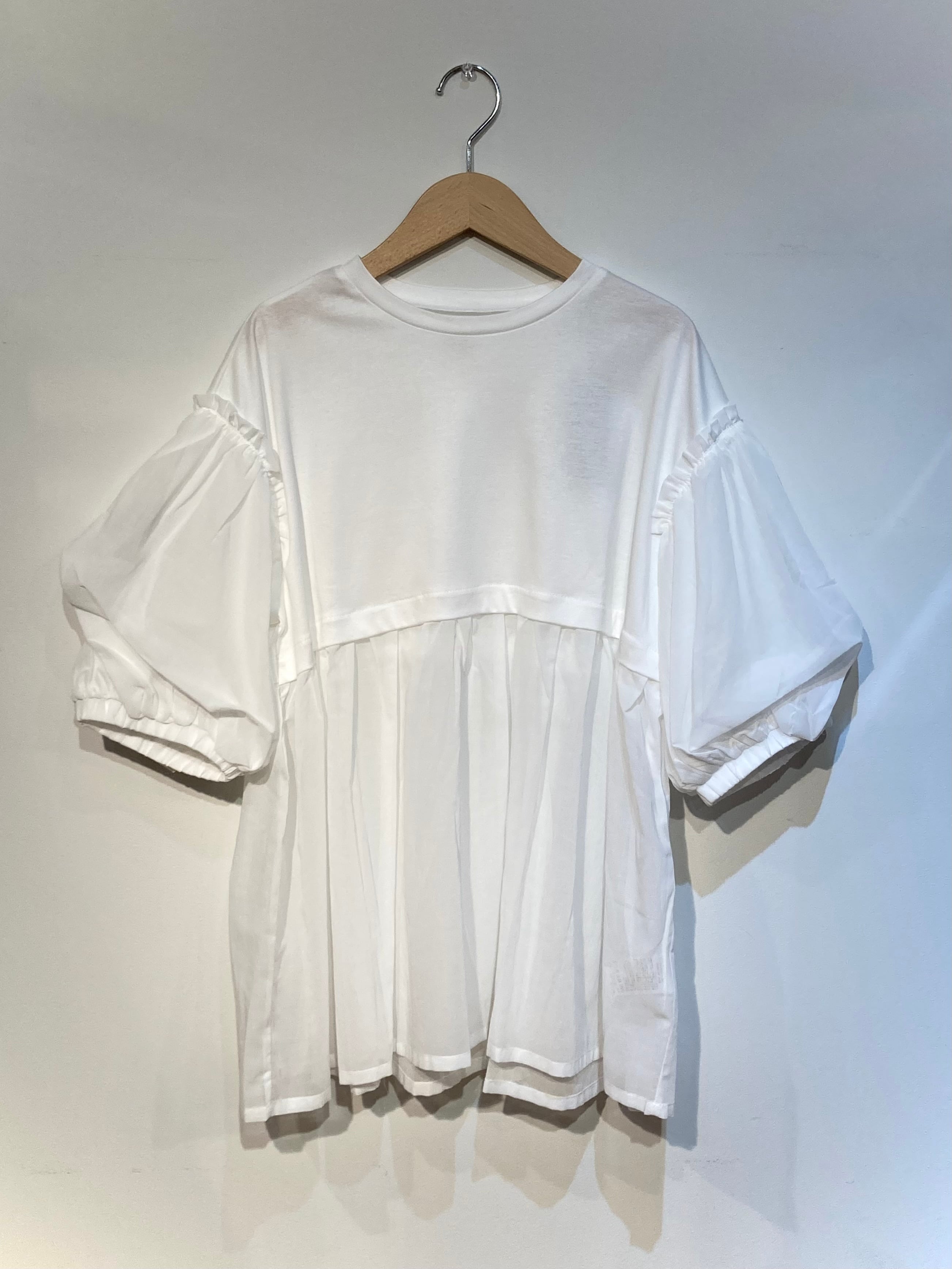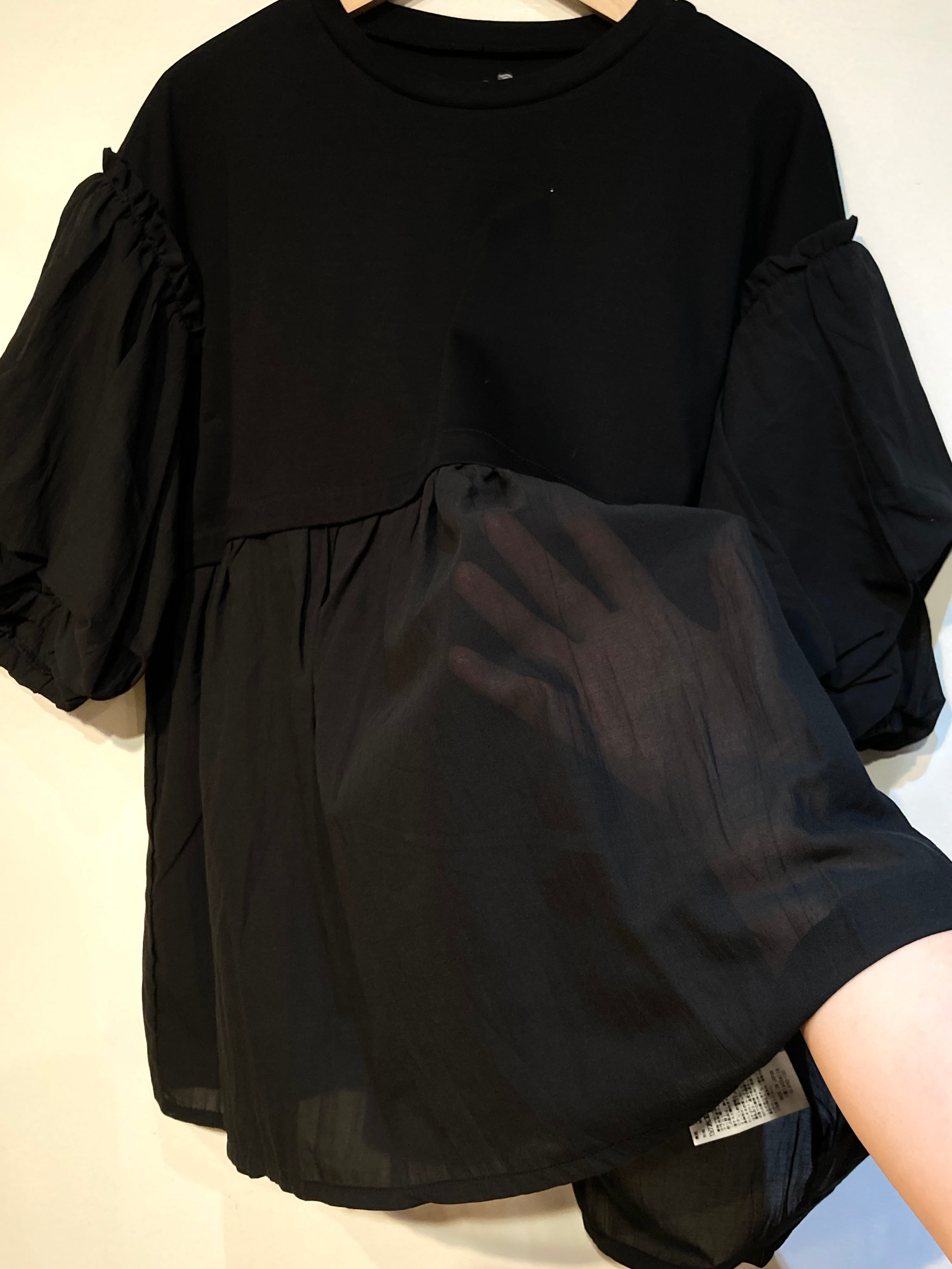 これからの季節にピッタリなマーラのトップスが届いてます!スムース生地とシフォンのドッキング。胸下にギャザーを寄せ、ふんわりとしたシルエットになっているので体のラインを拾いにくいです。お袖は透けないように二枚重ねになっていて、ボリューム感をキープできるようなデザインがポイント✨パンツでもスカートでも可愛くオシャレに着ていただけます!