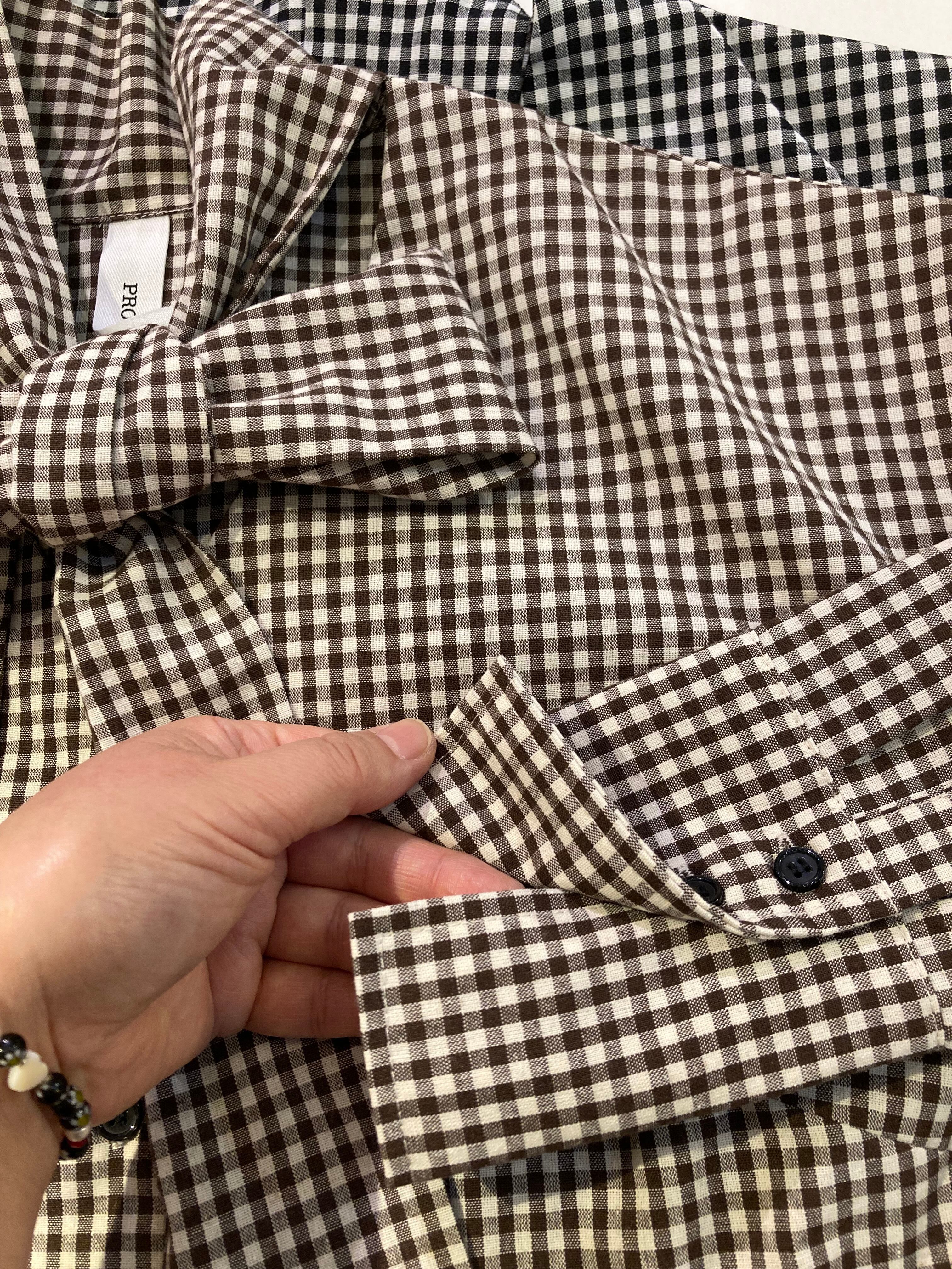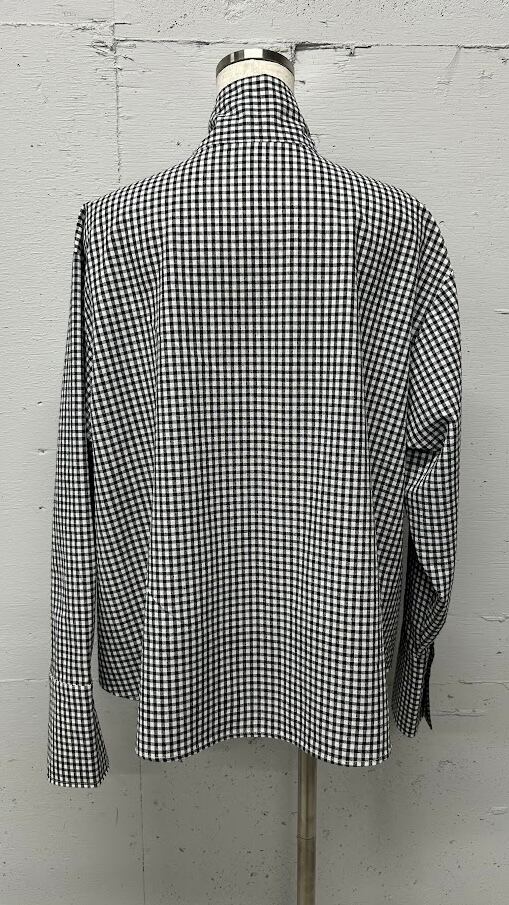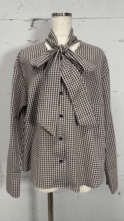 フェミニンになりがちなボウタイブラウスを綿混のギンガムチェック生地を使用する事で少しカジュアルダウンさせてます。