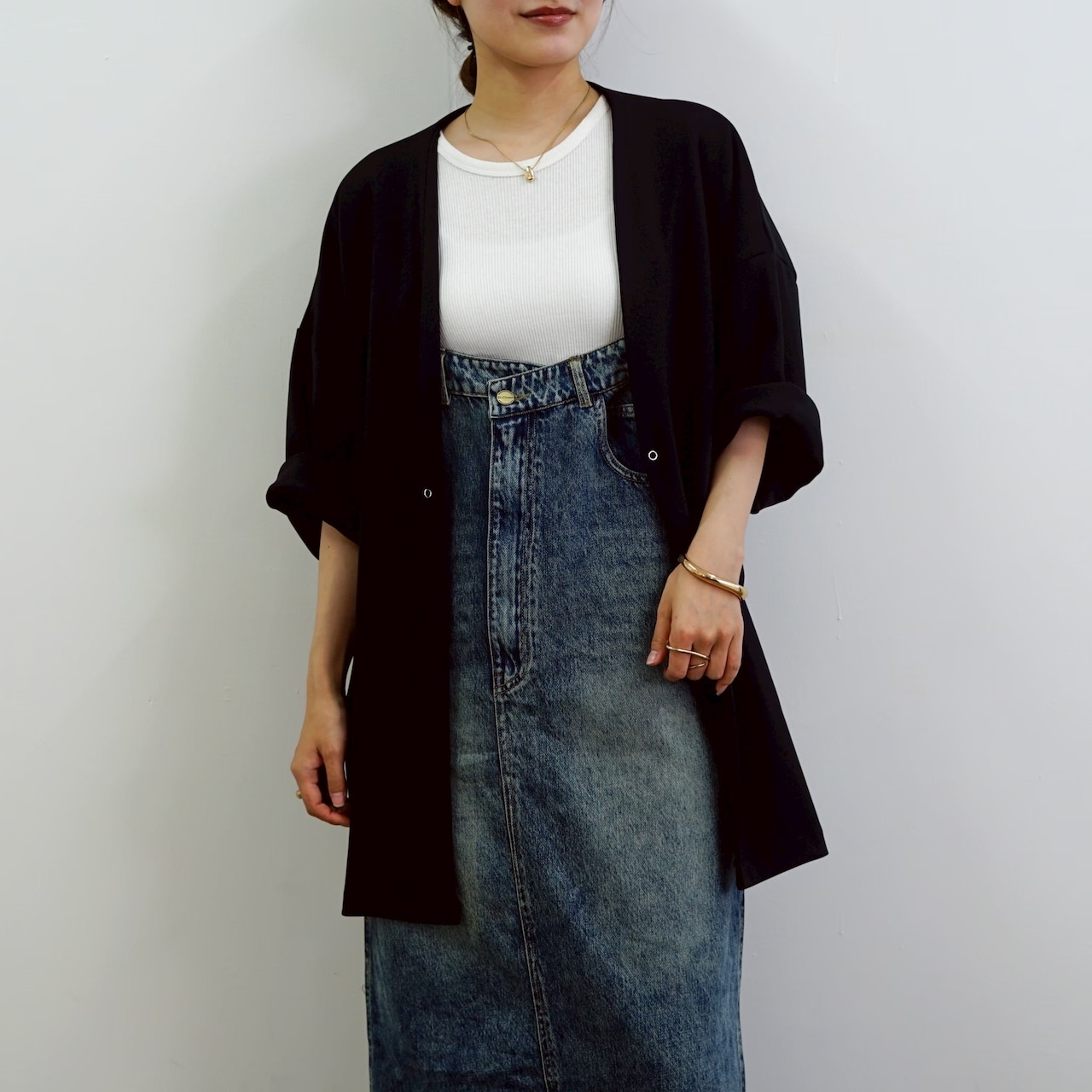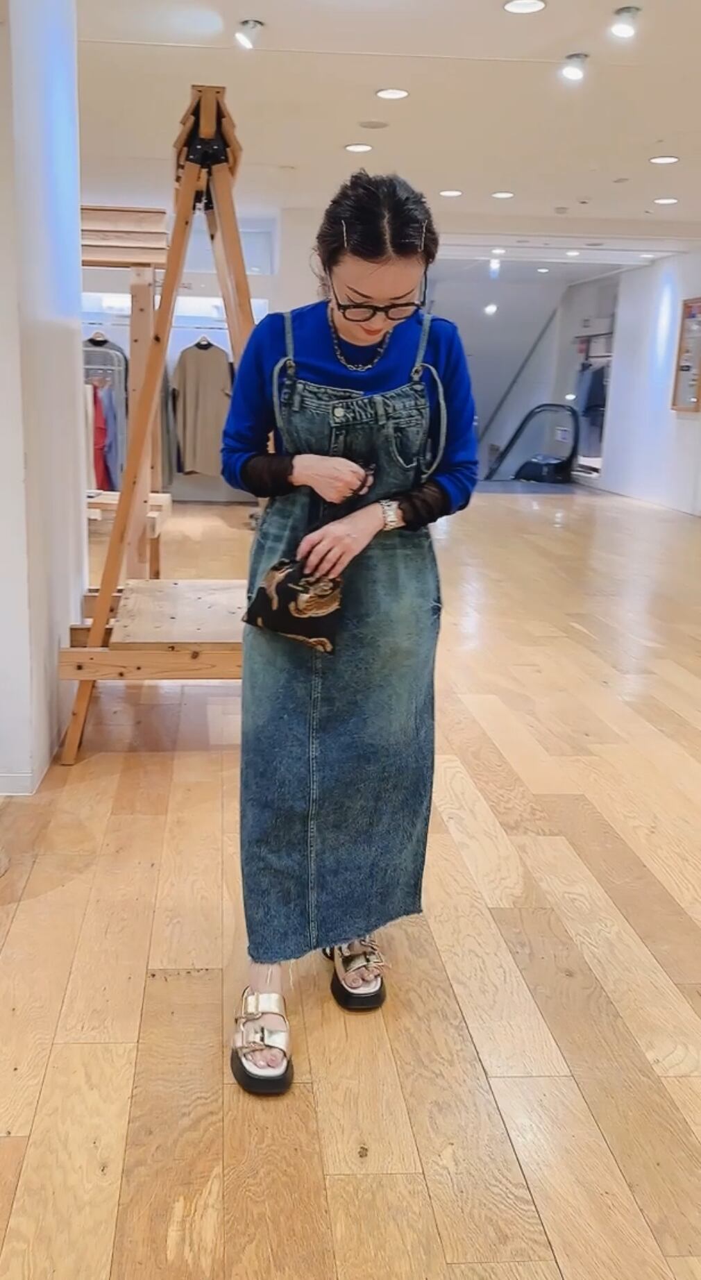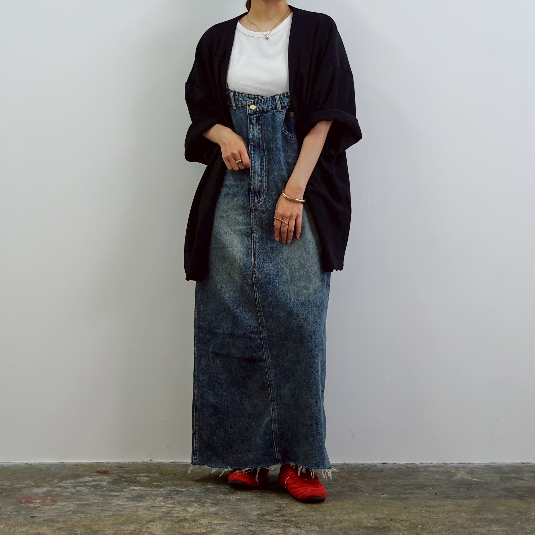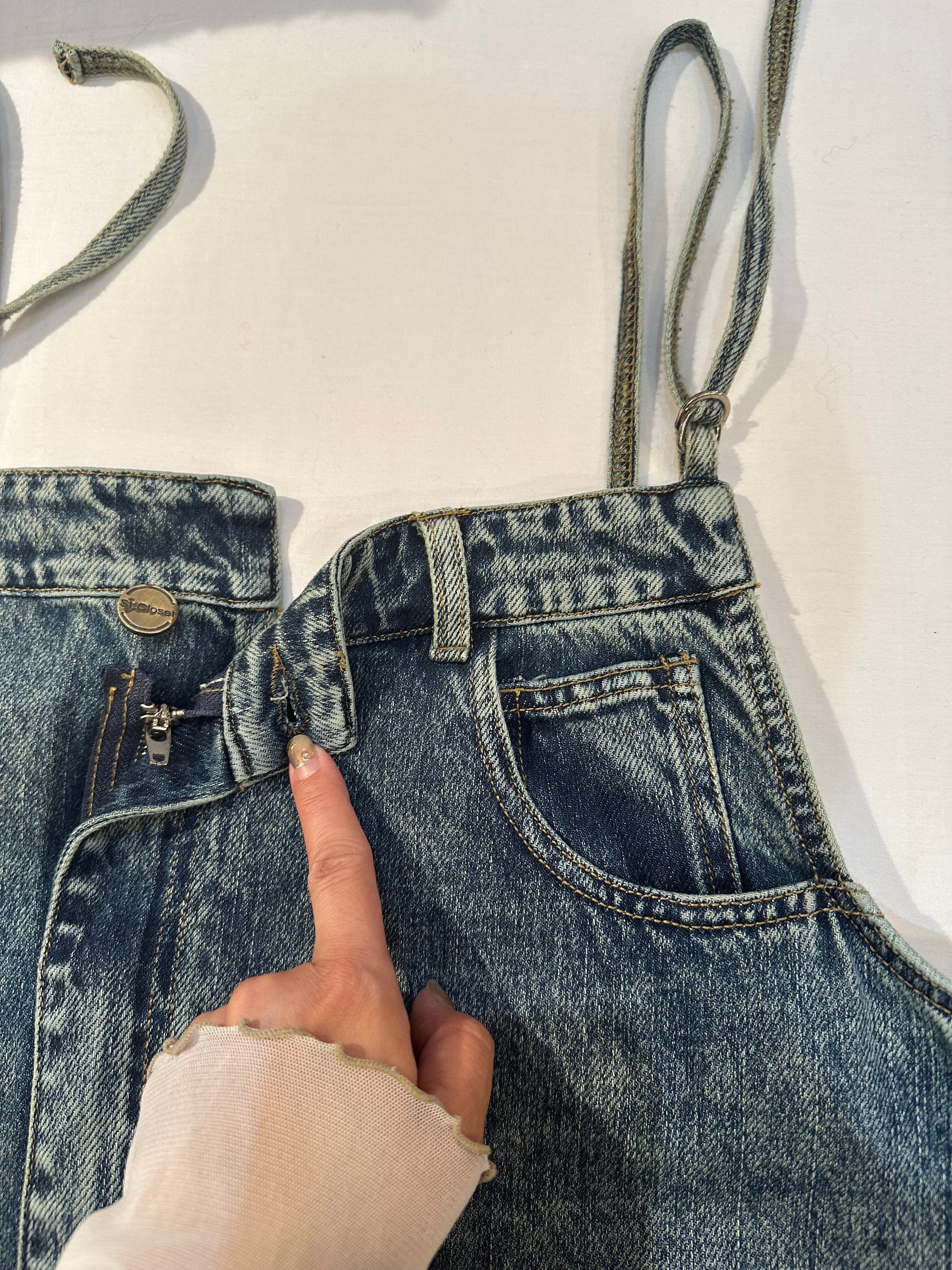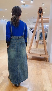 デニムスカートのウエスト部分が胸元にきた様なディテールです。