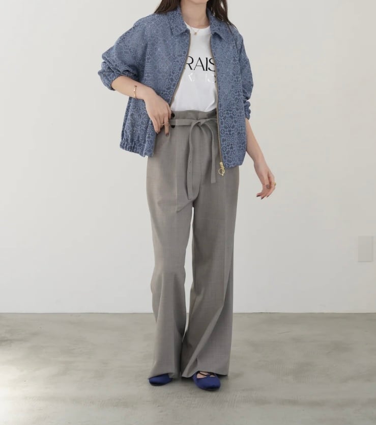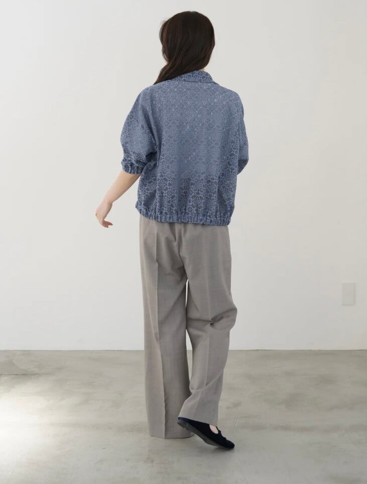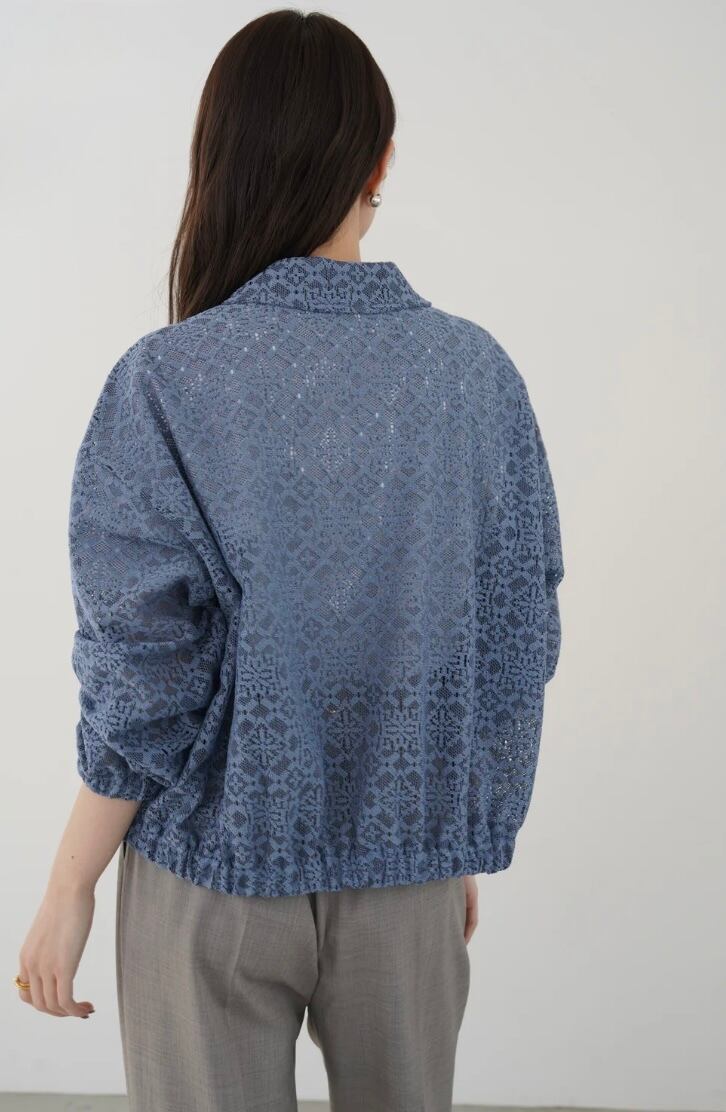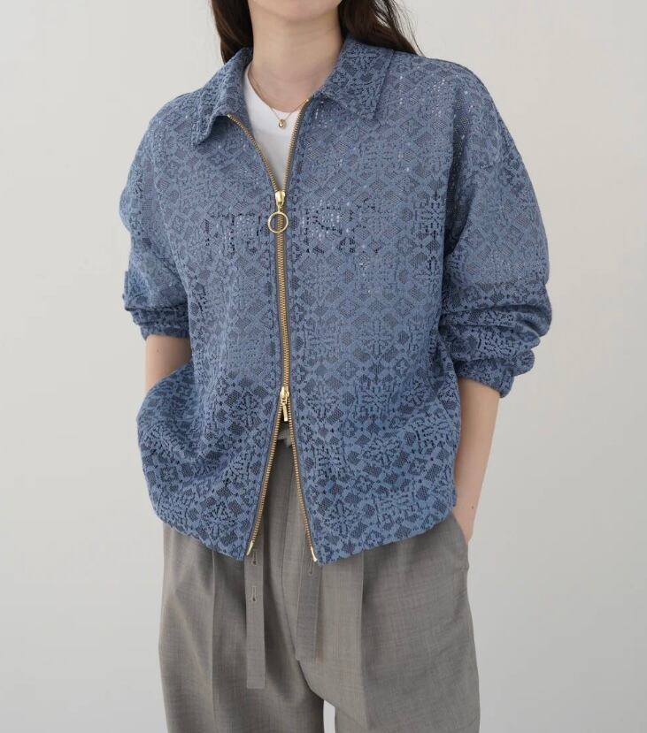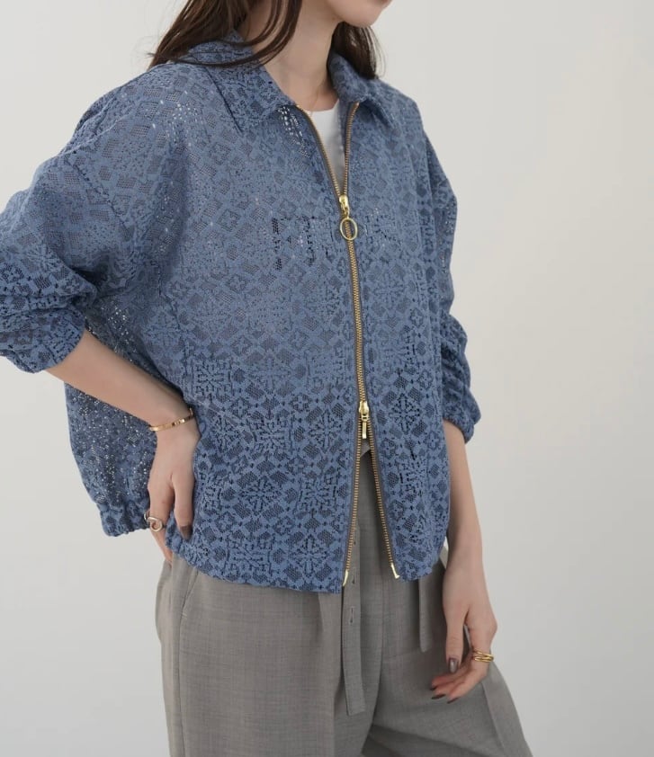 ソフトな風合いのジオメトリックレースを、クラシックなスウィングトップ型に落とし込んだブルゾン。襟の芯地や裏地を付けずに、あえて軽く仕立ててレースの透け感を楽しめるので、これからの時期に着れるブルゾンです。丈もちょうどいい丈感なので、スカートにもパンツにも合わせやすいです。