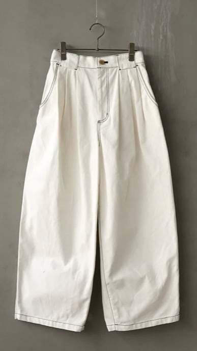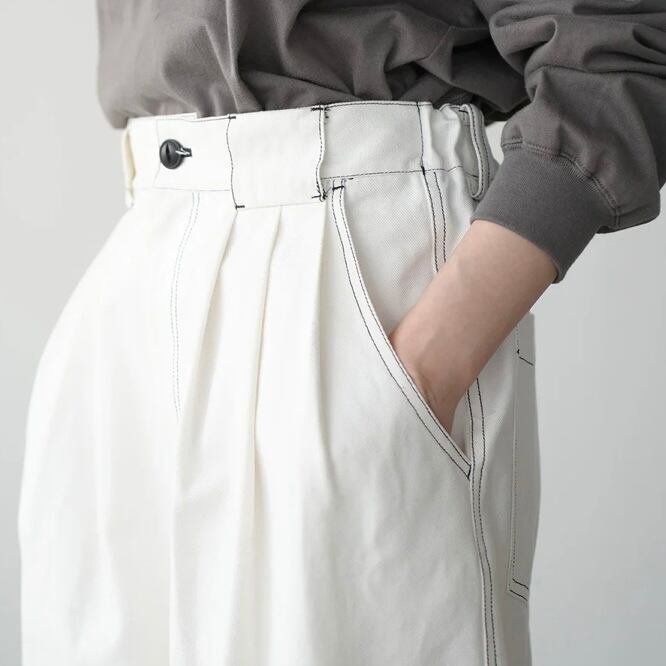 サイド3タックでゆとりを取ったワイドテーパードパンツで、程よいボリューム感と丈感で大人カジュアルに仕上げています。