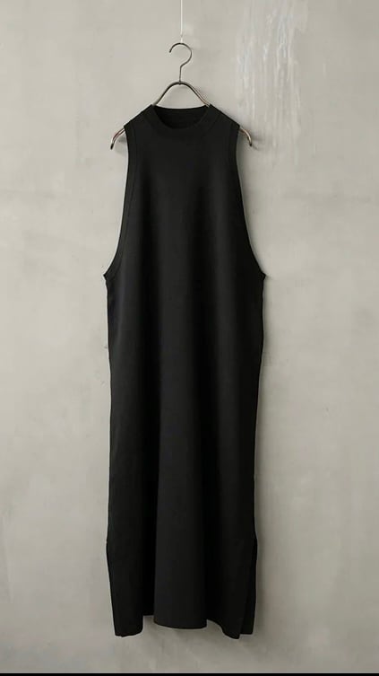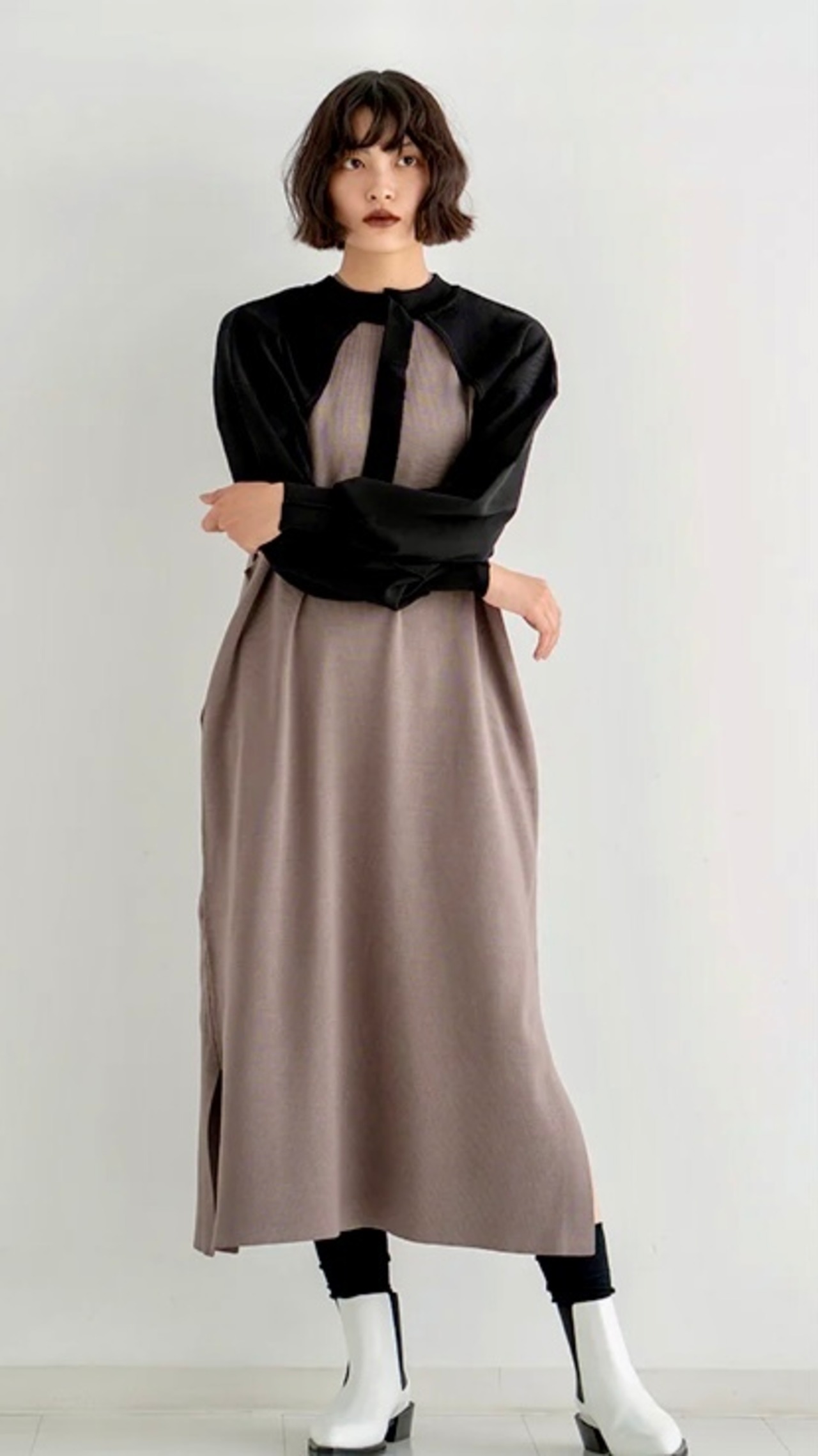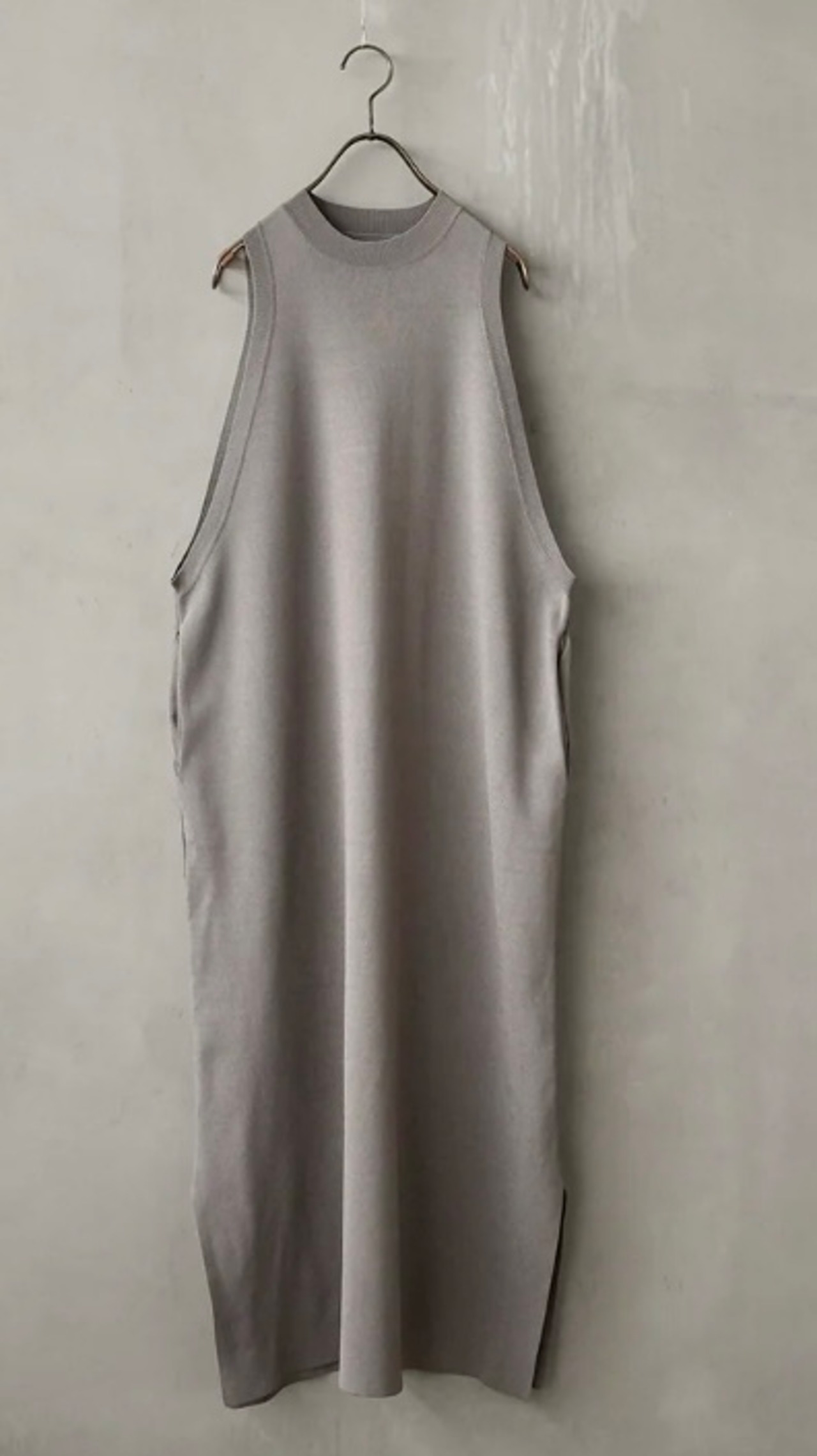 モックネックでアームホールをぐっと落とした抜け感のあるミドル丈ワンピースです。