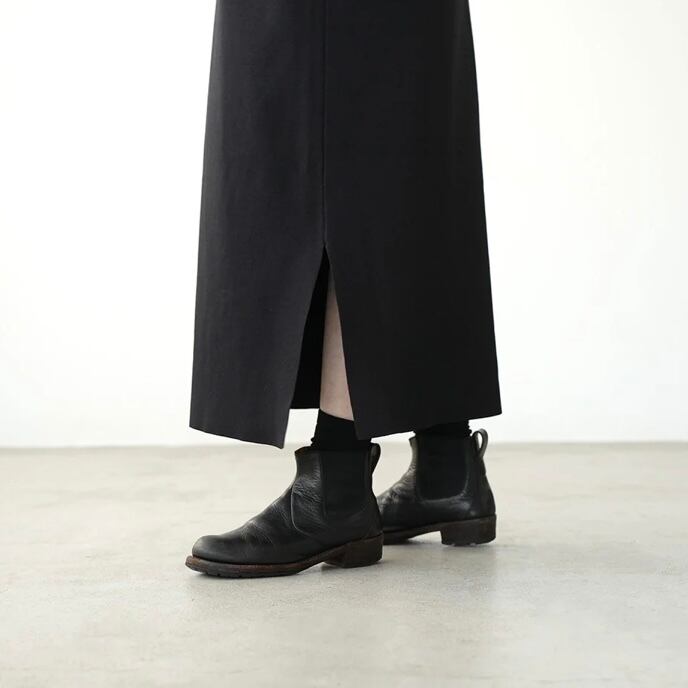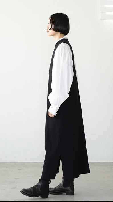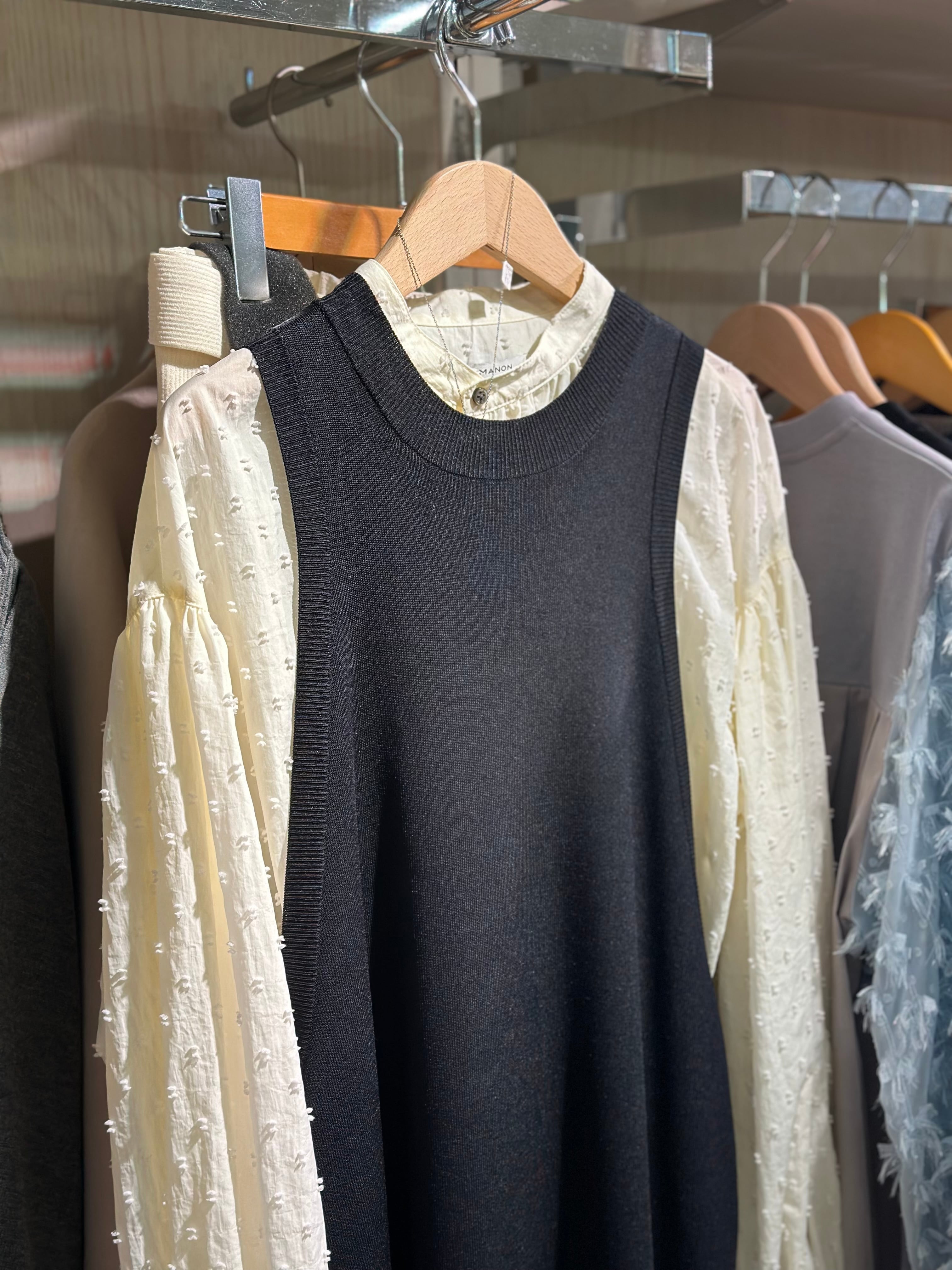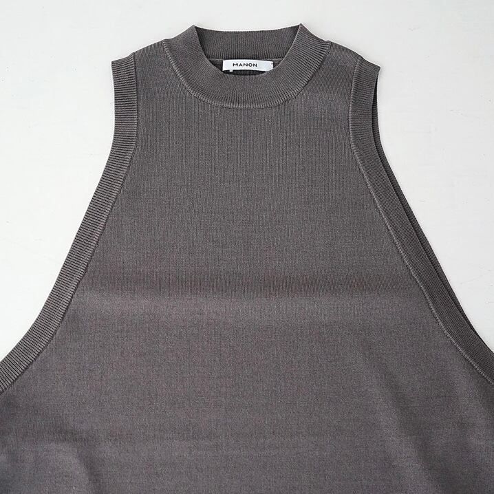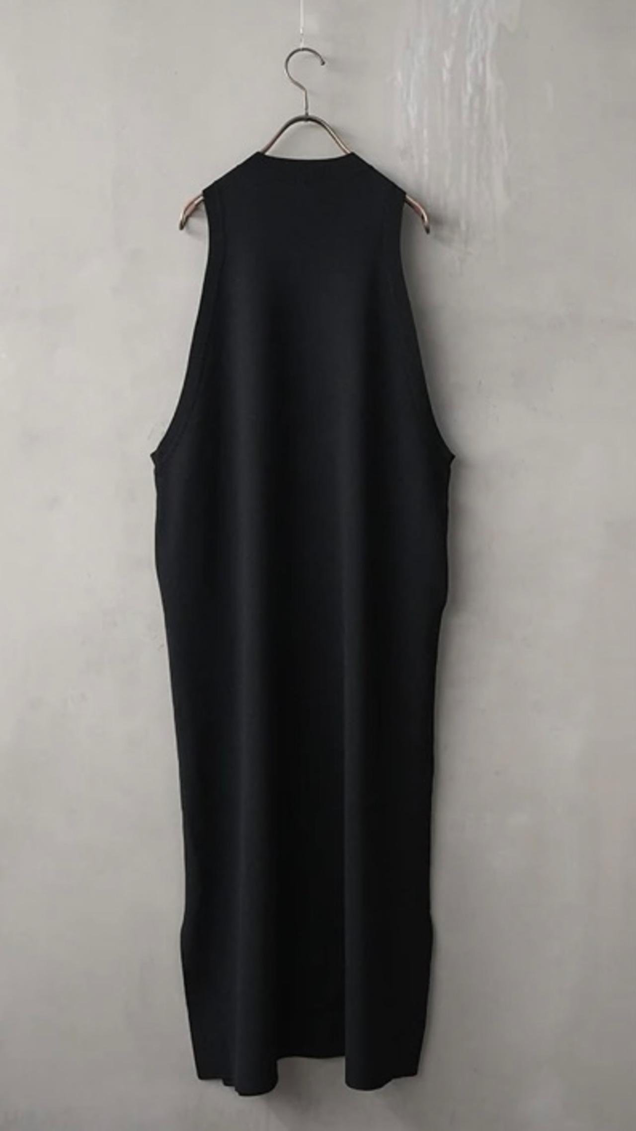 モックネックでアームホールをぐっと落とした抜け感のあるミドル丈ワンピースです。