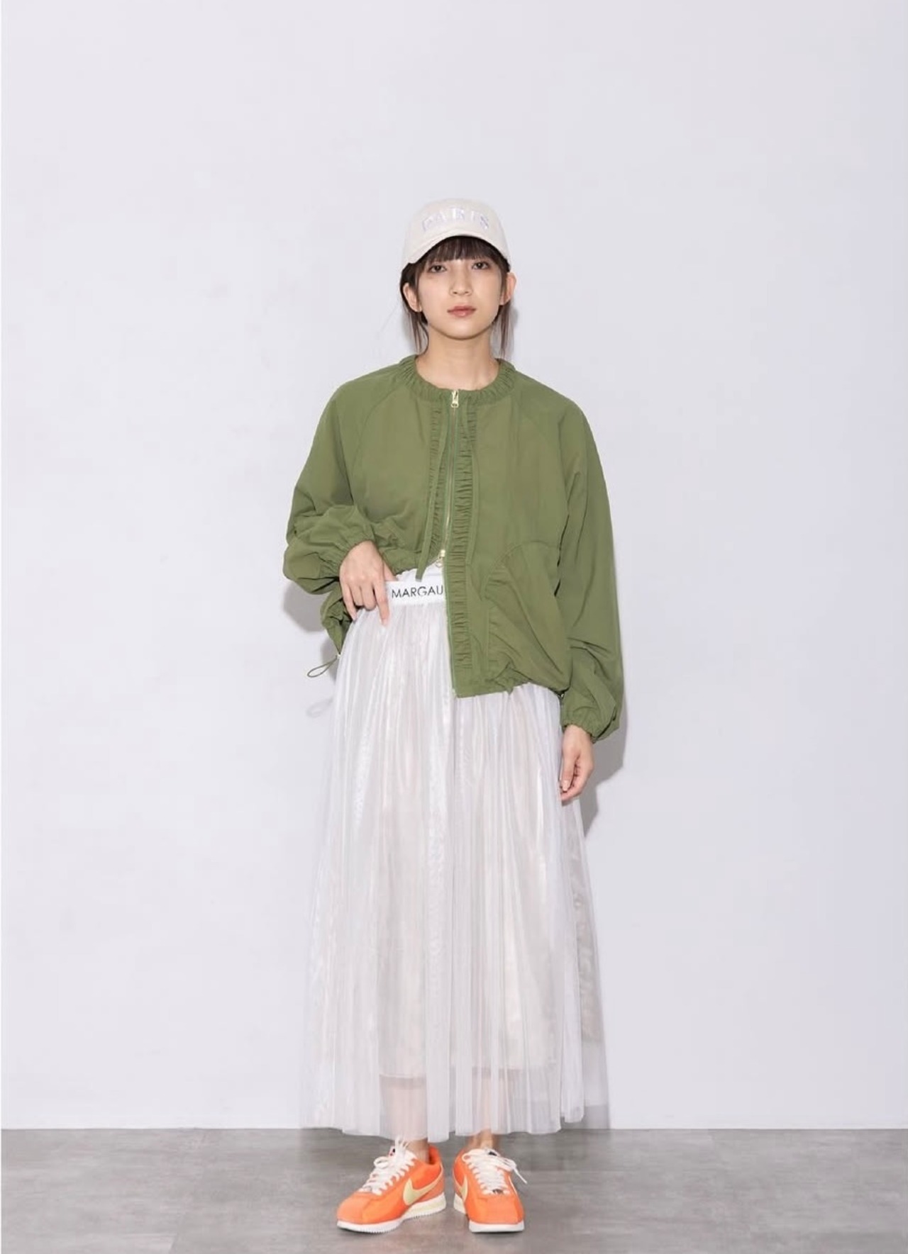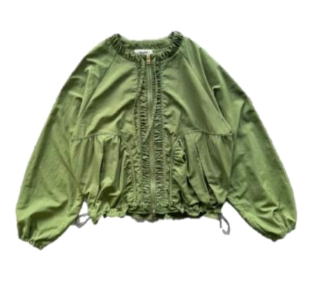 ノーカラーブルゾンで縁にフリルが付いているので、他のブルゾンや羽織りとも違いが出そうです。