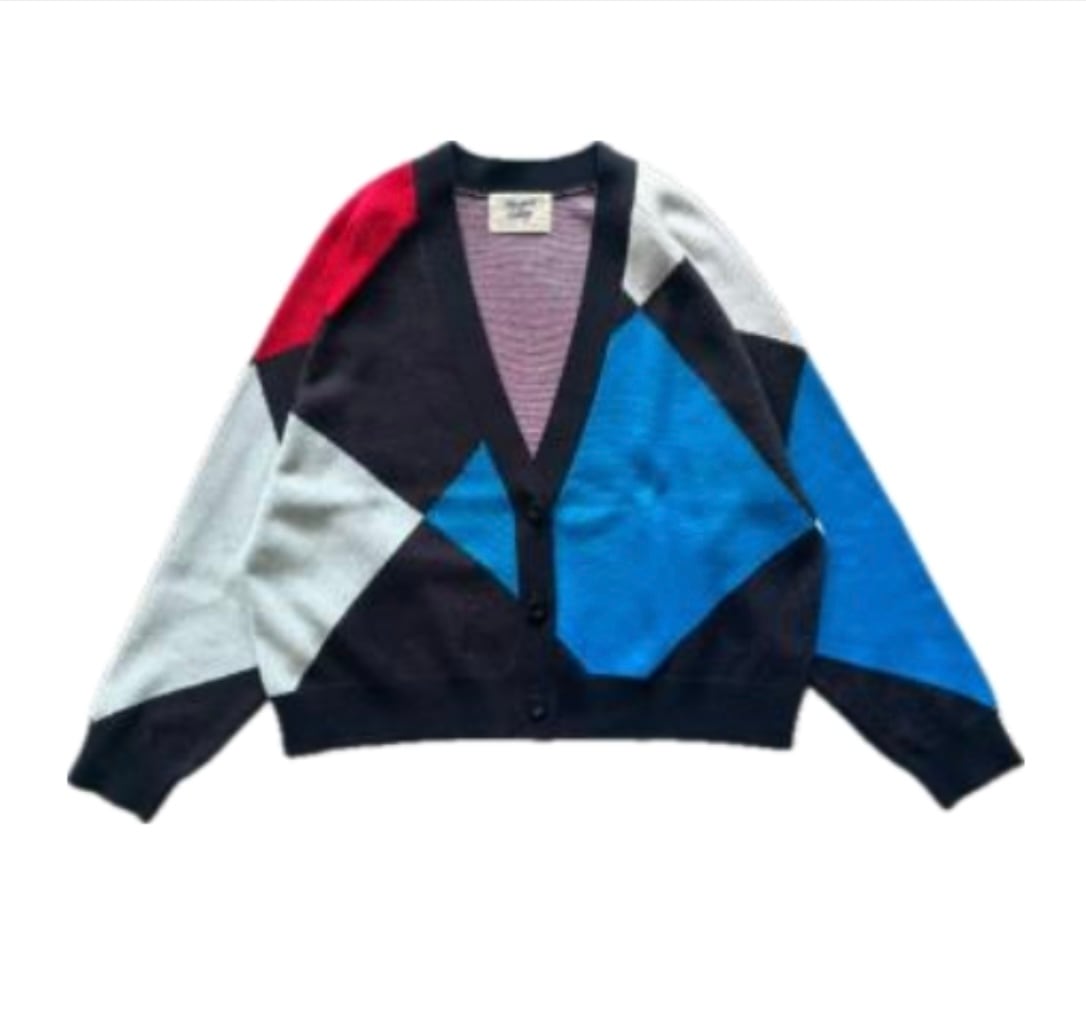 大きいアーガイル柄の配色が目を引くカーディガン。