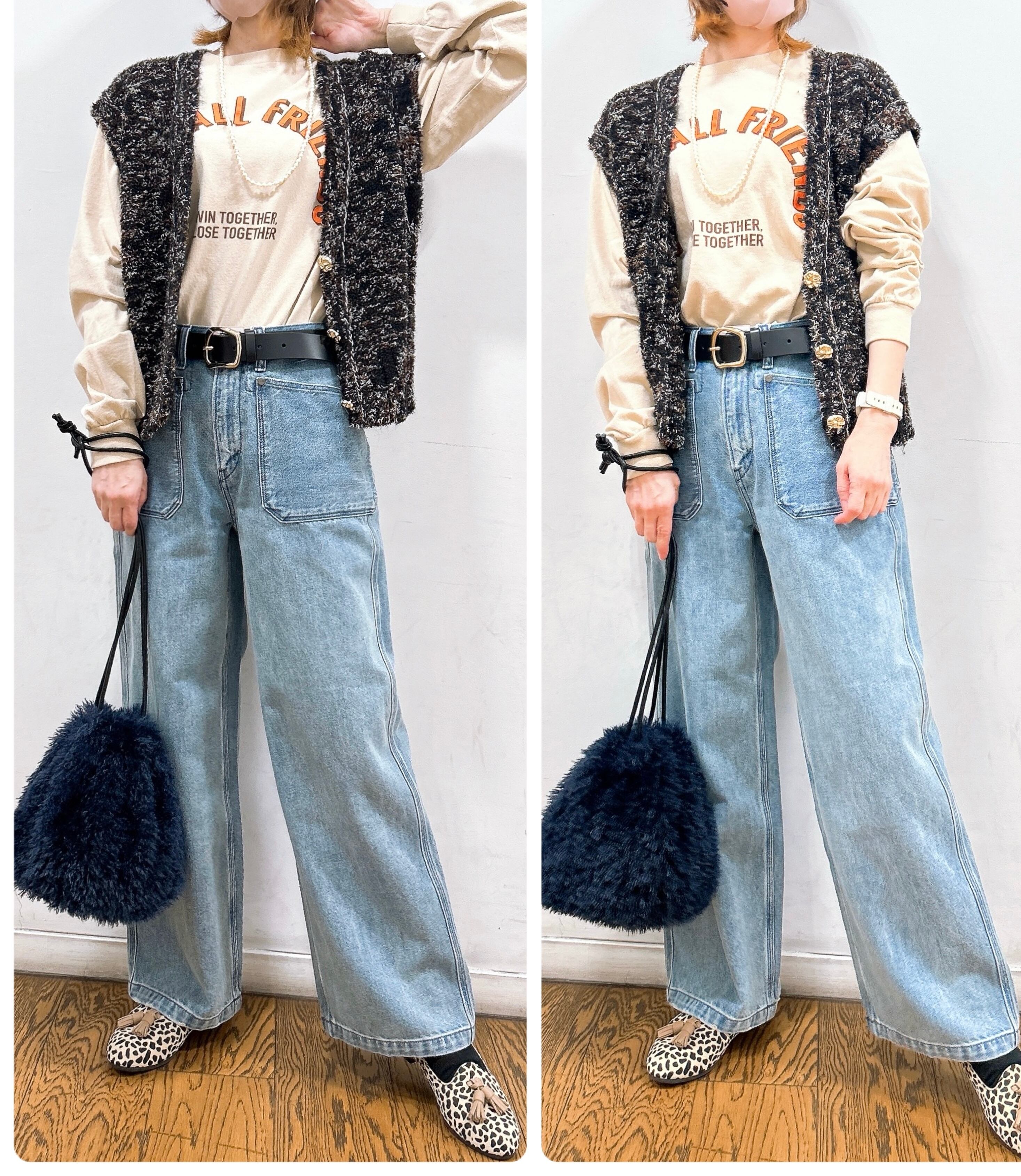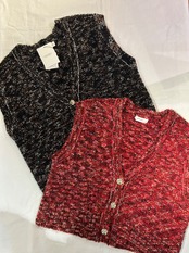 色が混ざったシャギーヤーンと単色のループヤーンを引き揃えてツイード風に編み上げられたニットベストです。首元や袖口は切り替えでラインが入ったように見えてフラットに見えないようにデザインです。ゴールドの変形ボタンもポイントです。コーディネートに華やかさをもたらしてくれる主役級アイテムです。