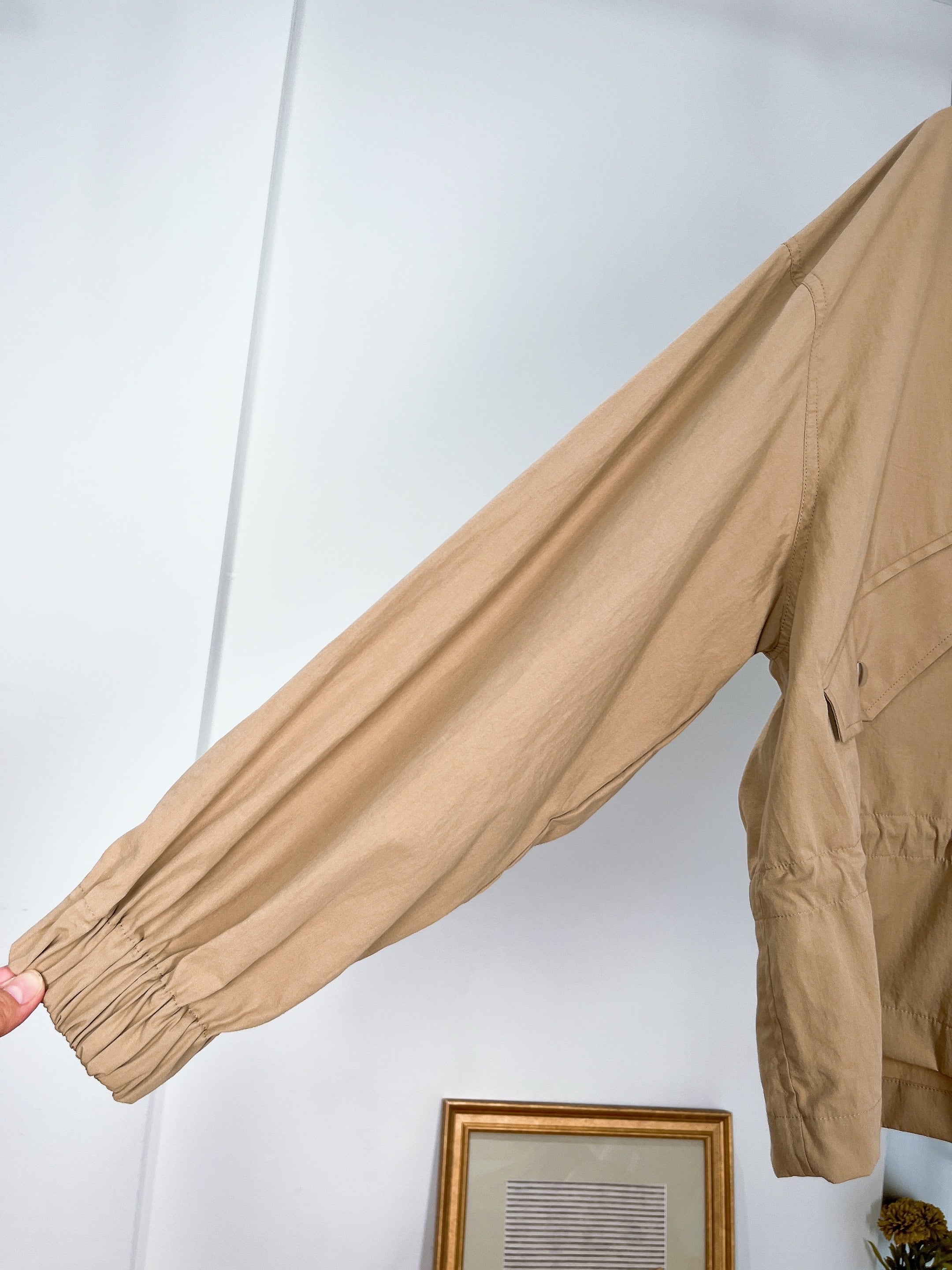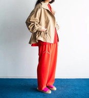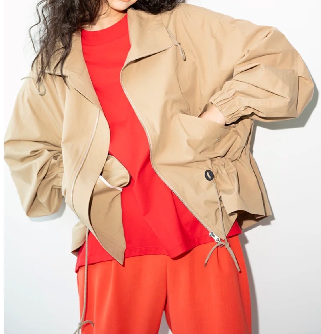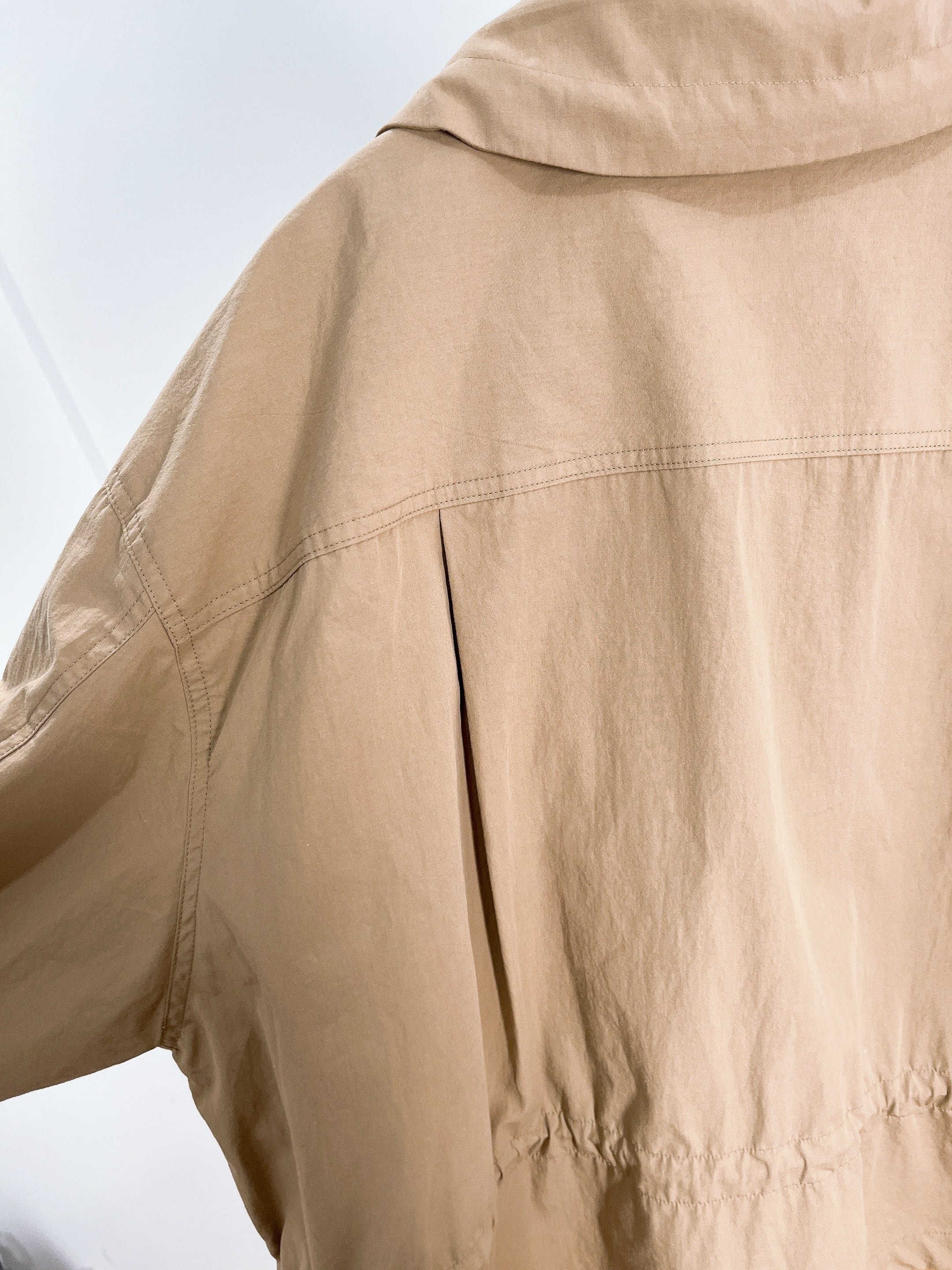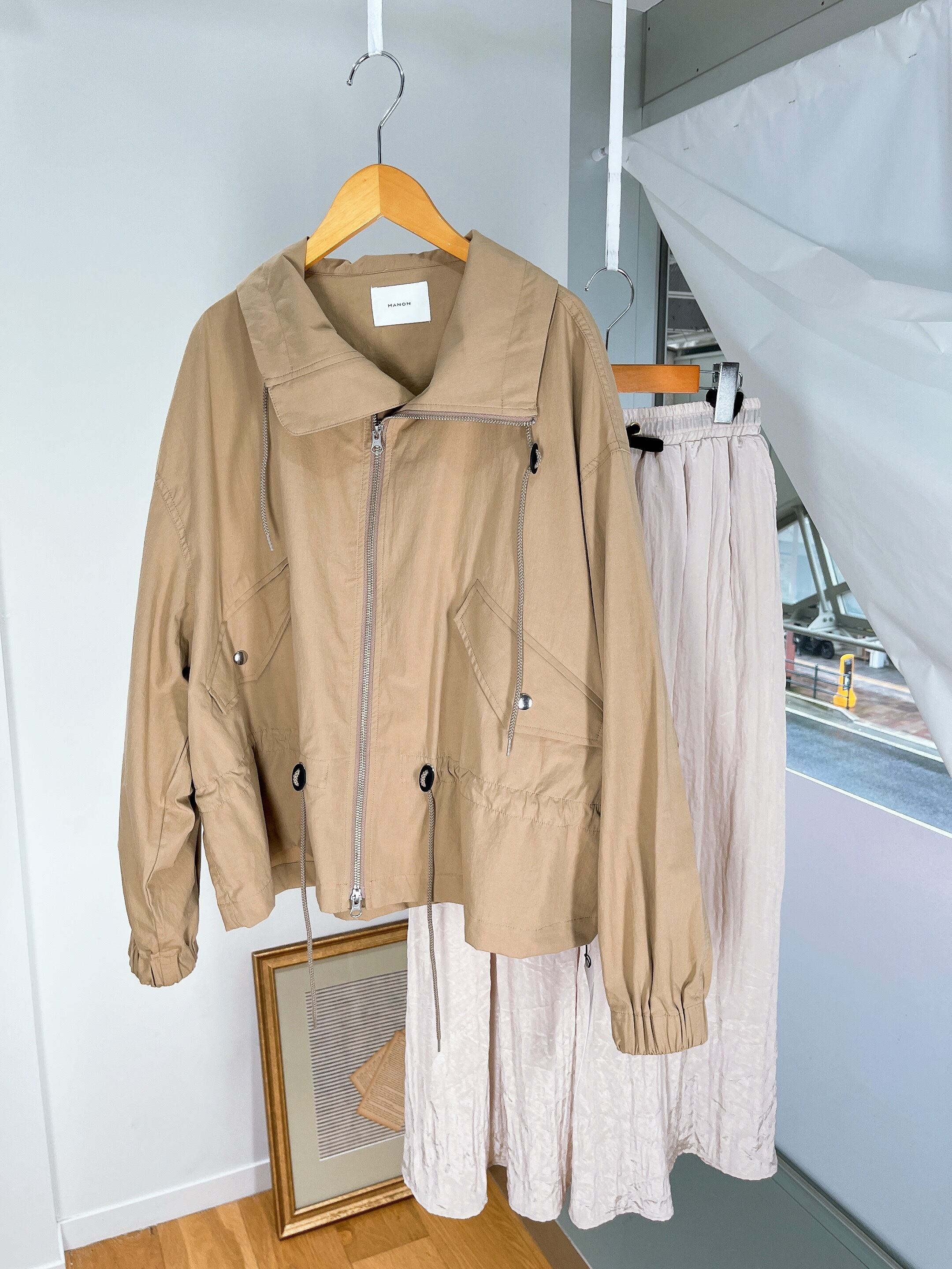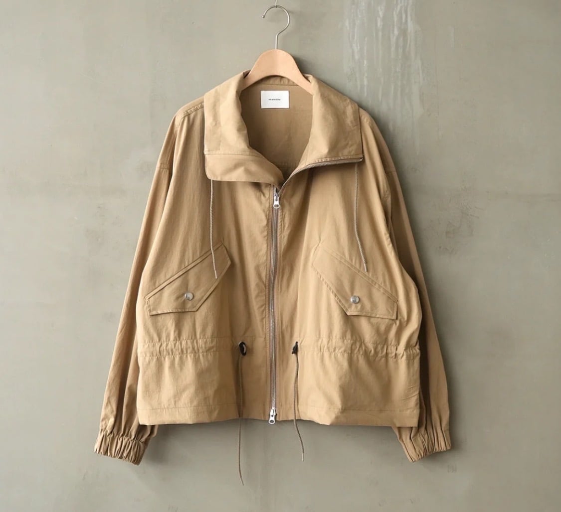 秋や春に重宝するジャケットで、襟はスタンドカラーで、ウエストのスピンドルでお好みのシルエットで羽織っていただけます。
