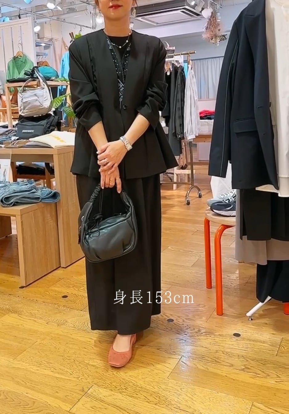 カチッと感も残しつつギャザーで柔らかく女性らしい雰囲気があります。カーデっぽく軽く羽織れるのもポイントです。